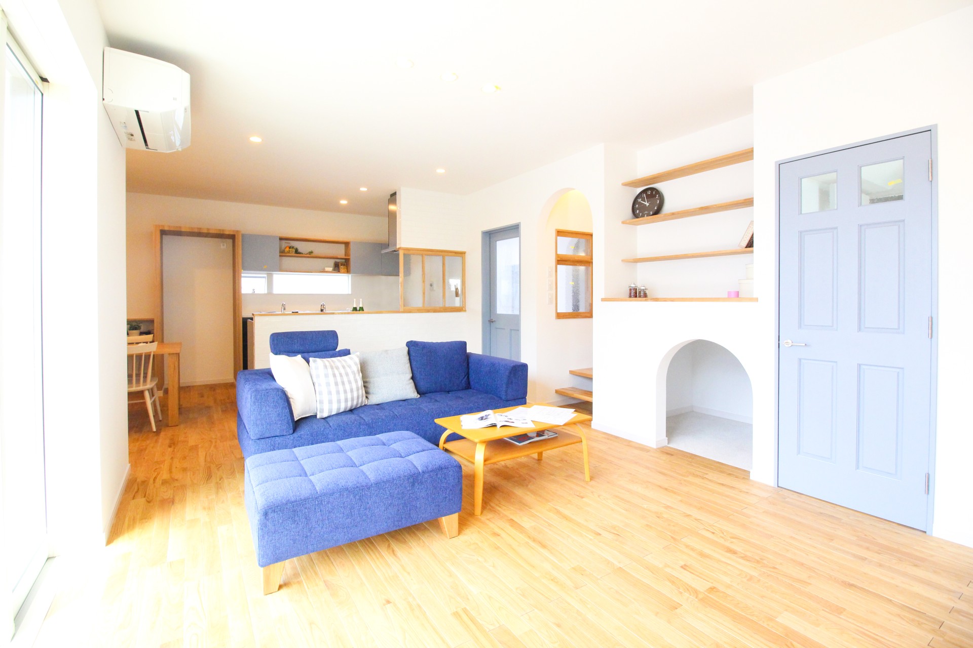 白い壁にやわらかな光が降りそそぎ、ブルーの扉が静かに微笑むリビング。