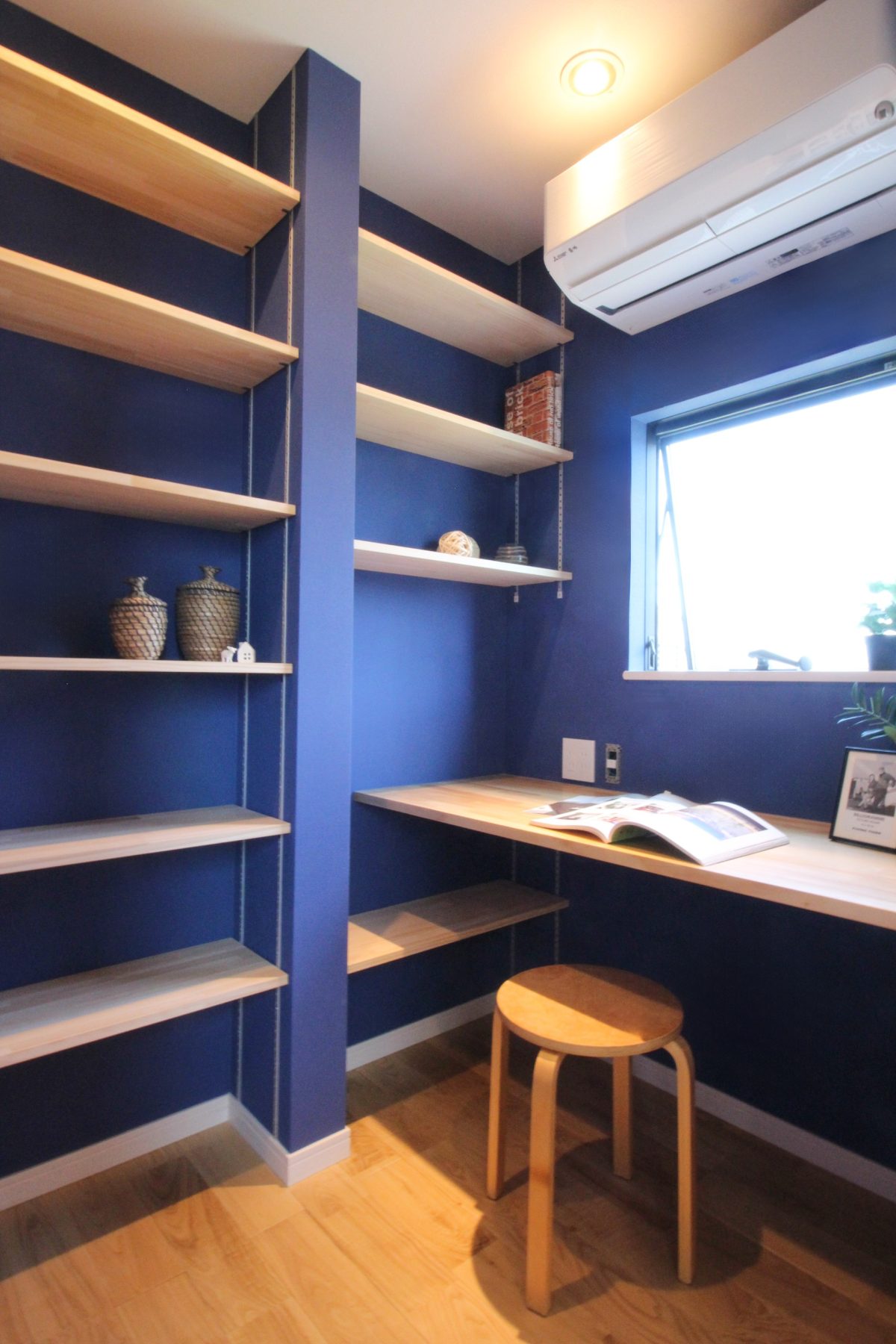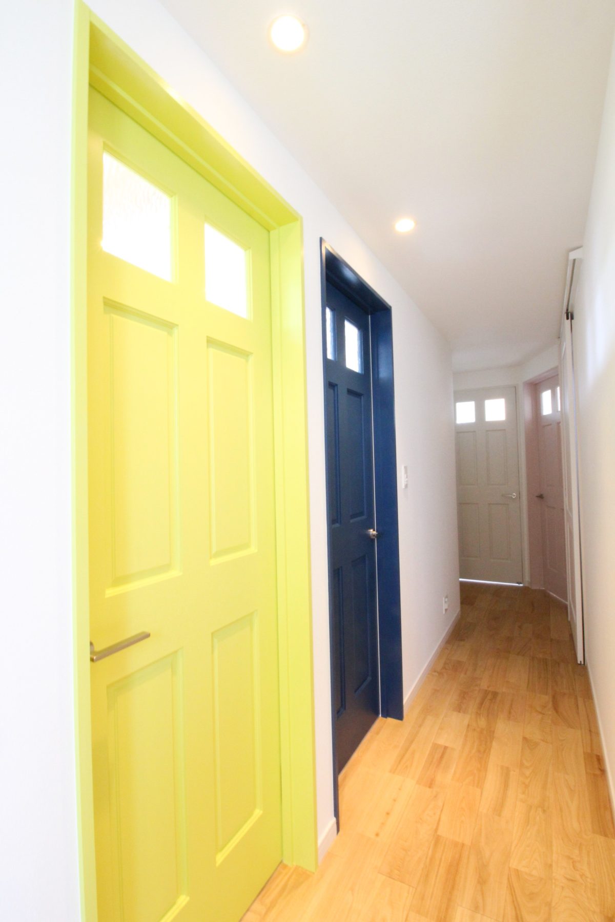2階は、各部屋ごとに異なる建具の色を選び、家族の個性が彩りとなって弾むカラフルな世界に。