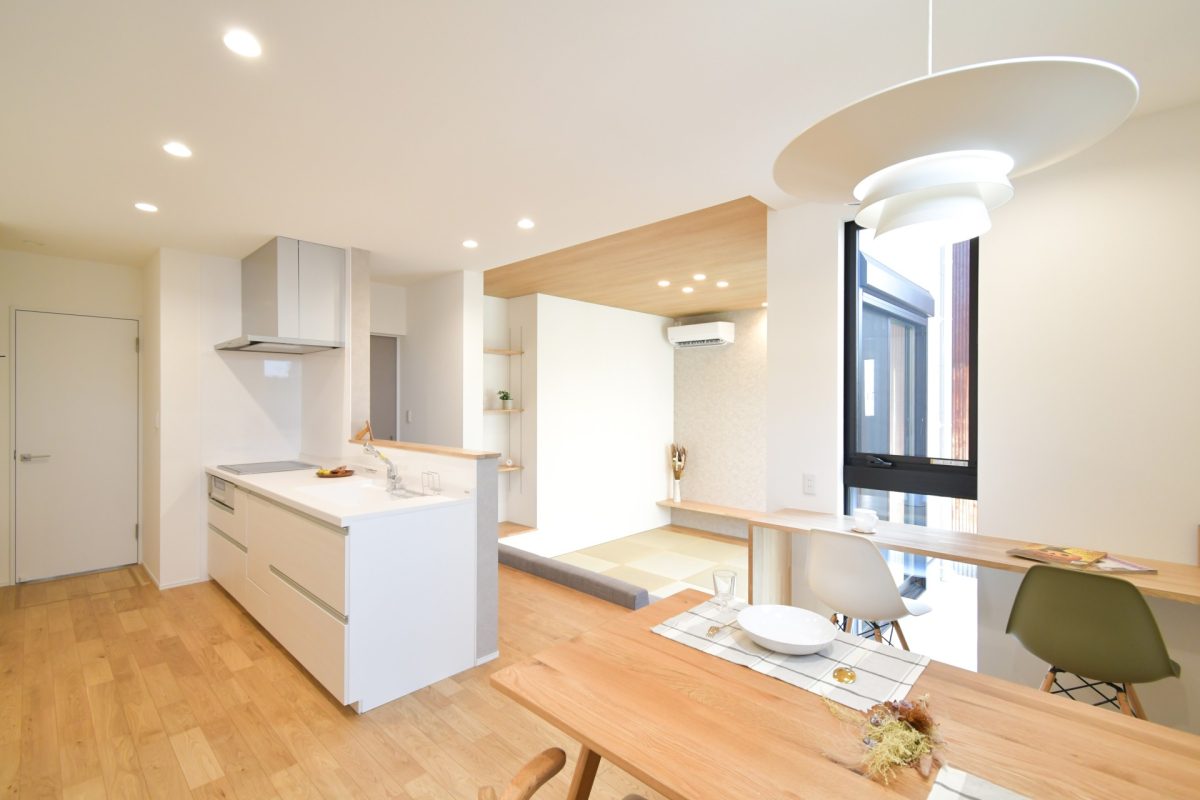 南に開かれたダイニングカウンターからは、タイルデッキの景色を眺めながら、学びも仕事も家事も、やさしく暮らしに溶け込みます。