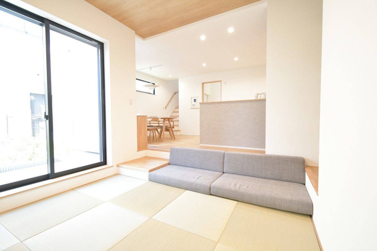 Wood Modern & Gray Style -タイルデッキとたたみ敷きのロースタイルリビングのある家-