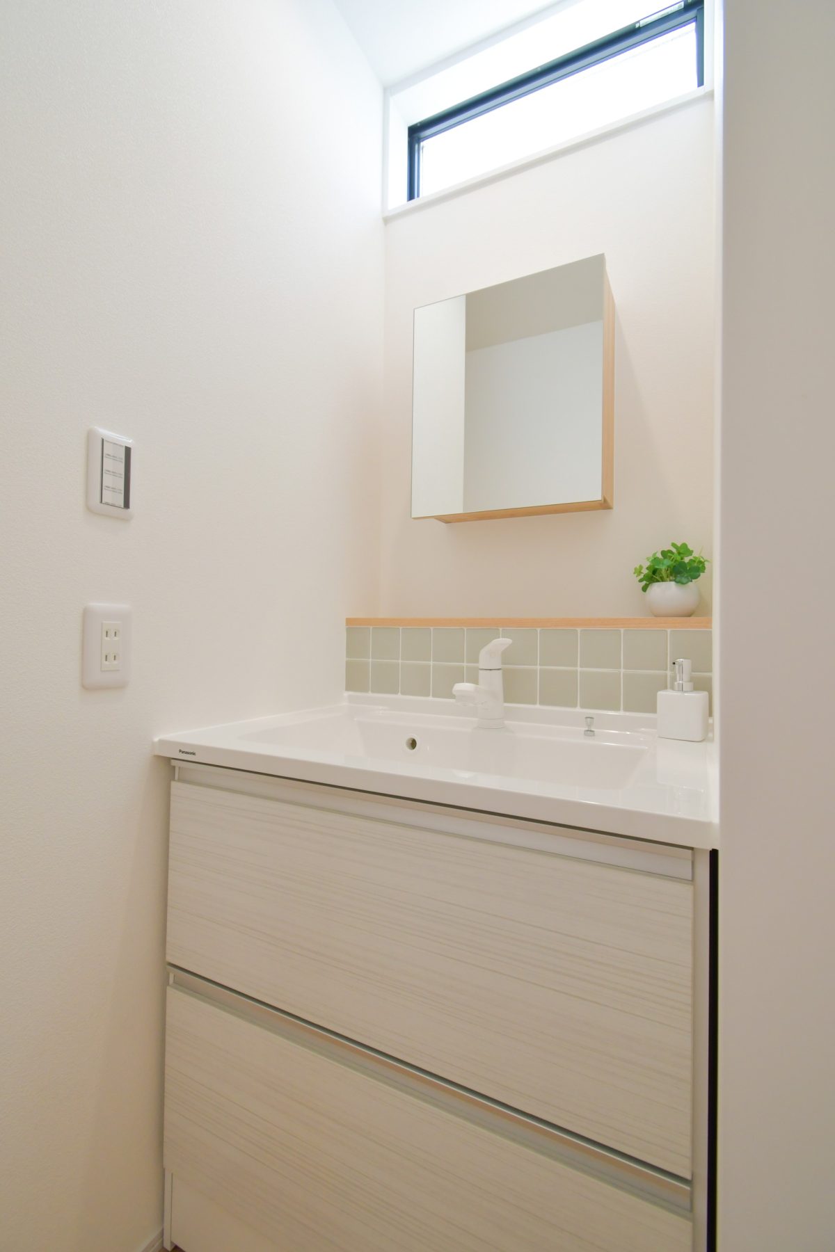 造作の洗面台にはタイルをあしらい、日常をほんの少し特別に演出。 外観はグレーと木目が織りなすシンプルな美しさ。